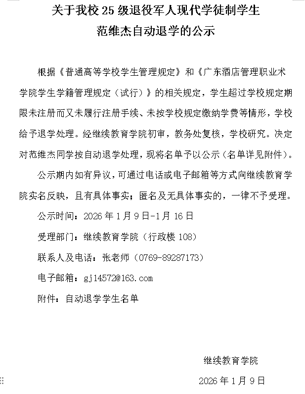 关于我校25级退役军人现代学徒制学生范维杰自动退学的公示